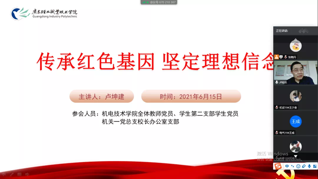 6月15日下午,卢坤建校长在线上为机关一党总支校长办公室支部、机电技术学院全体党员教师和第二支部学生党员讲授了主题为“传承红色基因,坚定理想信念”的党课,由该院党总支书记宋霞主持。