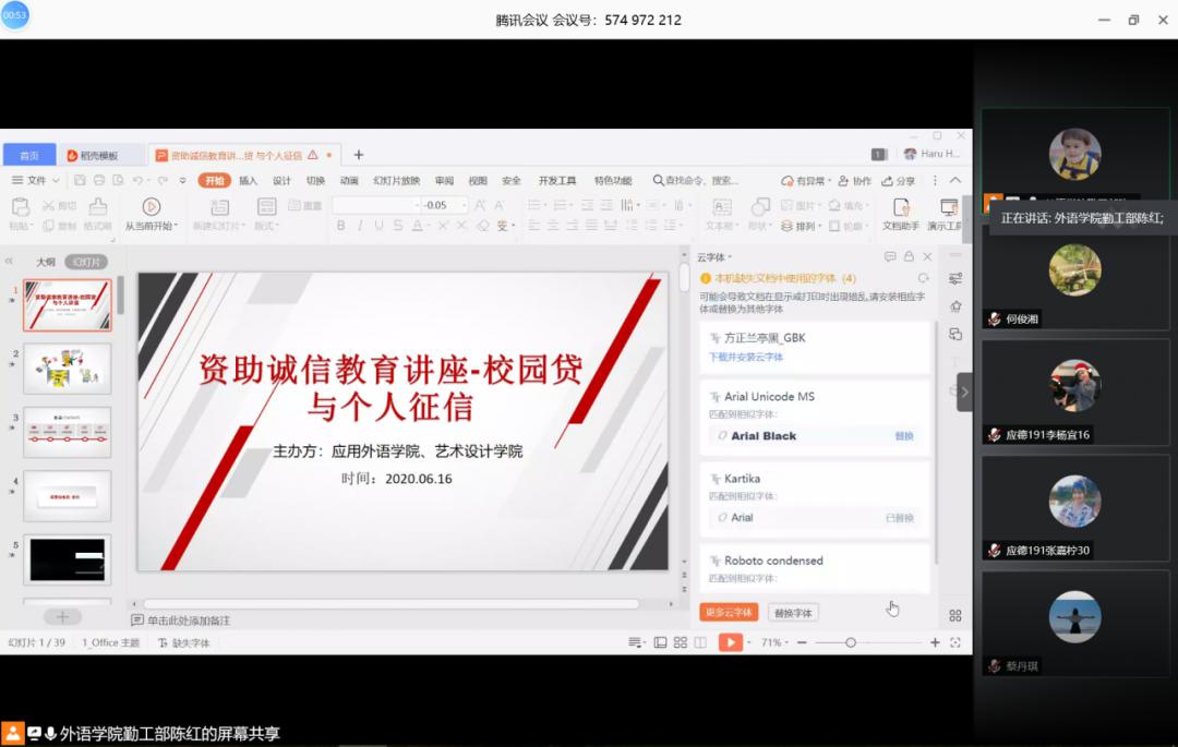 诚信于心,明礼于行。诚信是为人之道、立业之本。为了增强青年学生的诚信意识、责任意识和金融防诈骗意识,近日,应用外语学院和艺术设计学院联合举办线上资助诚信教育主题讲座。应用外语学院辅导员蔡丹琪,艺术设计学院辅导员毛莉莉、何俊湘,2018级、2019级应用外语学院和艺术设计学院学生资助工作负责人陈红、叶甫长及学生代表共200余人参加本次讲座。