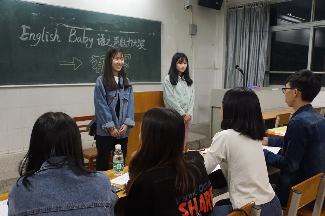由校团委主办的、应用外语学院分团委学生会承办的,以“For the challenge ,for the voice”(为挑战而来,为声音而来)为主题的English Baby 语之声魅力大赛初赛于11月19日晚7:30分在我校广州校区教学楼503教室进行。应用外学院王杰英、赵艳芳、林晓娜同学以及来自财贸学院的大二师兄担任了本次大赛评委。