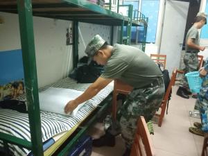 首先观看了6栋的男生宿舍,看着稍乱的宿舍,教官亲自悉心教导宿舍长如何整理宿舍的内务。教官表示:整理内务,总的标准是纤尘不染,整齐划一,美观靓丽,棱角分明,宿舍整体风格统一等。并规定被子的折叠和位置、床铺整理、生活用品、鞋的规范摆放、室内整体清洁程度提出严格的要求。“被子要叠的有棱有角,像一块豆腐块”,“鞋子要摆放整齐,成直线摆放,所有鞋的后跟要在同一方向”“牙杯牙刷的摆放方向相同、要整齐......”