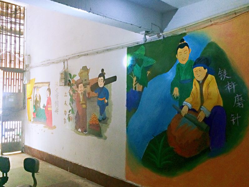 活动开始,借用社工准备的颜料和画笔,学子们在居民楼楼道现场装水调色和稀释颜料。由于这里的居民楼楼道狭窄,墙体也破旧不堪,因此给学子们的绘画活动增添了不少难度。然而这并没有使他们望而却步,一切准备就绪便着手进行。炎炎夏日,在狭窄的楼道内学子们顶着满头汗水,开始对比原图,利用地上的颜料、画笔和水桶里的清水,在小画盘上进行颜料对比与调色。调色是个硬功夫,比较考验色感以及水的配合度。虽然很多环境学院学子并不是专业的绘画能手,但凭借着对绘画的热爱,他们不断地进行尝试,最后也调出了理想的色调。